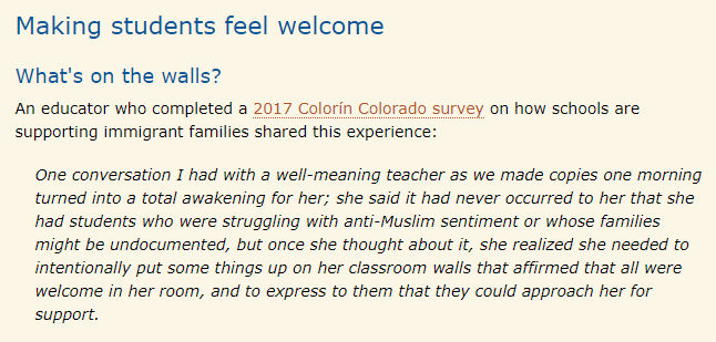 This in-depth summary of classroom-based approaches to countering xenophobia with Carola Suárez-Orozco and Elena Maker Castro outlines strategies that include starting with a “whole child” understanding of immigrant-origin students; becoming grounded in trauma-informed educational care, particularly around the specific types of trauma and chronic stressors immigrant-origin children and families may experience (such as ongoing threats of family separation, deportation of family members and limited access to healthcare); providing learning environments that are safe, supportive and caring; practicing culturally sustaining pedagogy(such as incorporating elements of students’ diverse historical and cultural legacies); helping students bridge the “empathy gap” through a scaffolded curriculum and well-managed dialogues that explore new perspectives and experiences; and making your classroom a place where civility and respect are modeled daily.